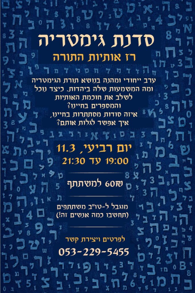 יש בהזדמנות כייפית ללמוד את תורת הגימטריה ב11.3 אצלנו בחושים ברמת גן!